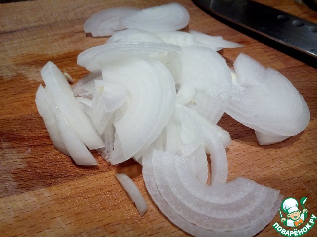 Когда филе промаринуется, нарежьте лук полукольцами и обжарьте в масле на разогретой сковородке до золотистого цвета.