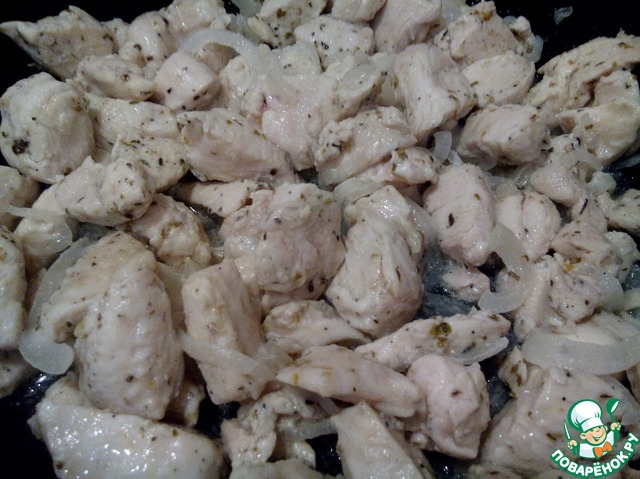 Добавьте курицу к луку и, помешивая, тушите до полуготовности.