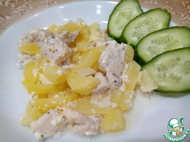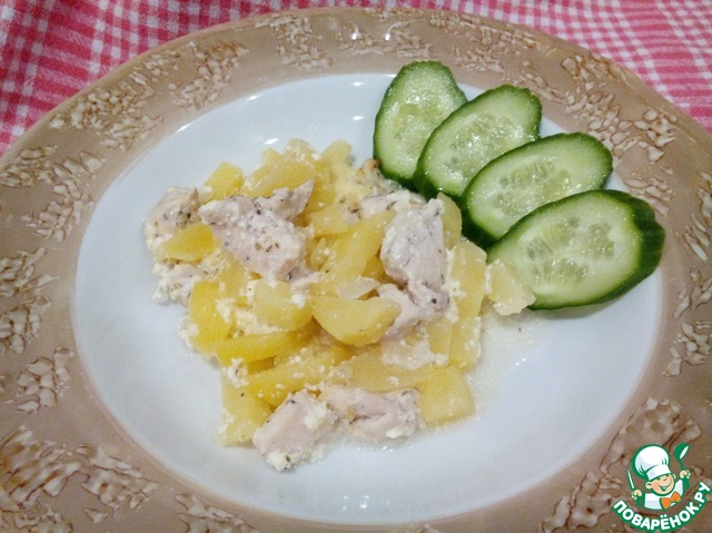 Когда сверху образуется нежная румяная сырная корочка, картошку с куриным филе можно вынимать из духовки.