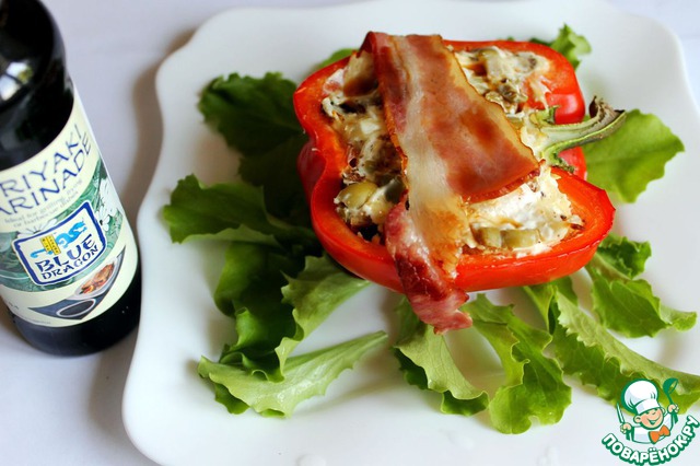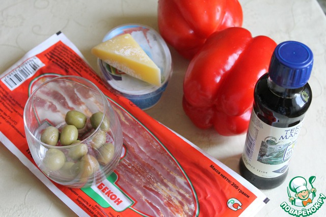 Наши исходные продукты: перец, соус-маринад Терияки от Blue Dragon, оливки, сыр козий сыр творожный, бекон. Хлеба кусочек забыла положить