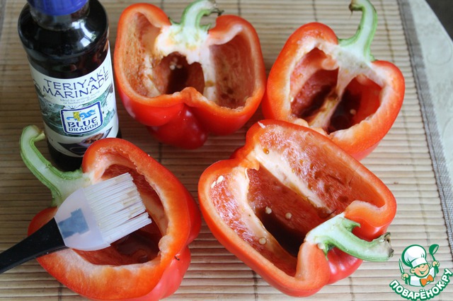 Перчики разрезаем пополам, смазываем с помощью кисточки соусом терияки