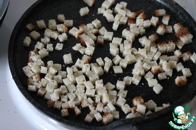 Кусочек хлеба режем мелкими кубиками, подсушиваем его на сухой раскаленной сковороде и делаем из него гренки