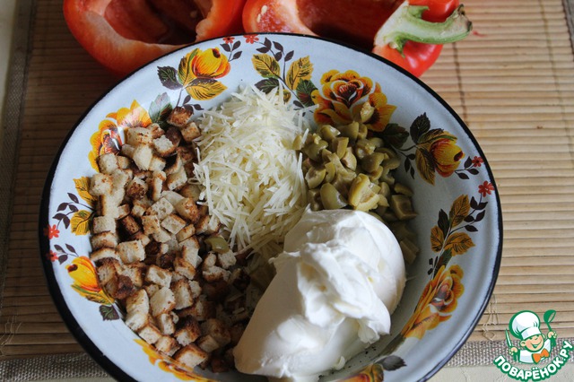 Смешиваю сыр творожный, сыр тертый козий, гренки, мелко нарезанные оливки. Сыр творожный иногда заменяла мягким сливочным, но козий надо оставить. Со сливочным сыром было еще вкуснее. Начинка вся тянулась, плавилась. Очень вкусно