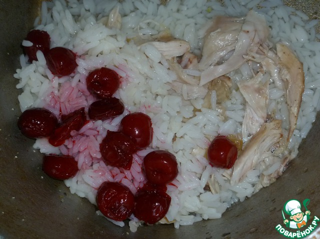 В казан влить 1/2 стакана воды, выложить половину риса, кусочки цыпленка, оставшийся рис и вишню. Томить в духовке 1 час при 160*С