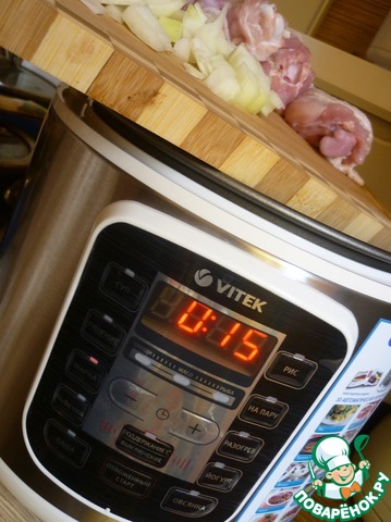 Для начала устанавливаем программу "Жарка" на 15 минут, распускаем в чаше сливочное масло и обжариваем, периодически помешивая курицу с нарубленным репчатым луком.