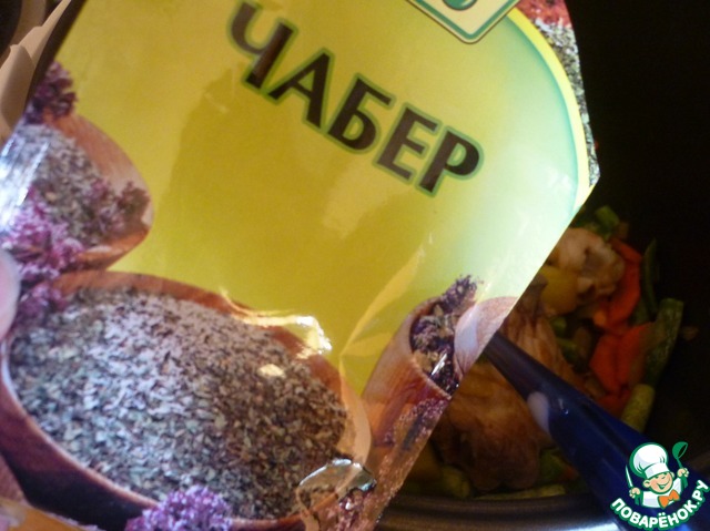 ... и чабрец (если сухой - 0,5 ч. л, если свежий 3-4 веточки). Влейте бульон.