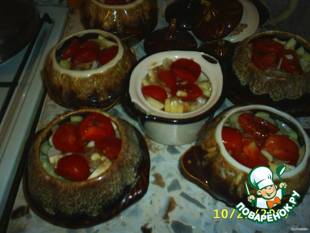 Кабачок, мясо, картофель, морковь, лук, грибы, перец - порезать средними кубиками положить в горшочки чередуя!