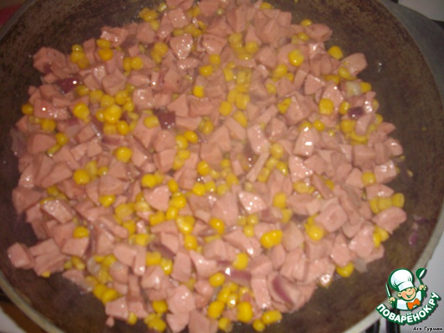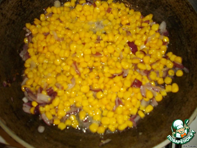 К луку присоединить кукурузу и продолжать обжарку, огонь немного увеличить.