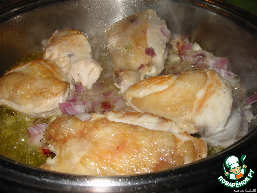 Разогреваем оливковое масло и поджариваем до корочки с одной стороны кусочки курицы. Переворачиваем на другую сторону. Добавляем мелко нарезанный лук. Тушим до приобретения цвета у лука