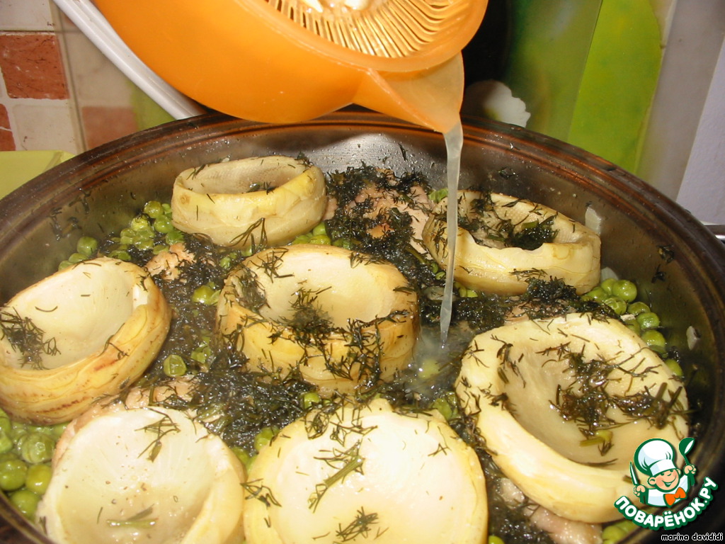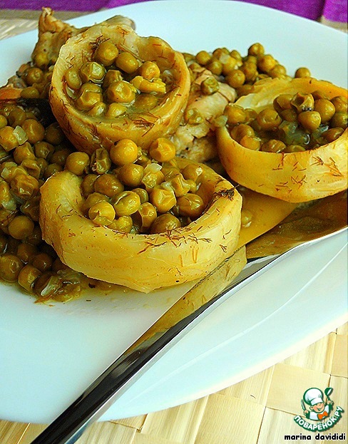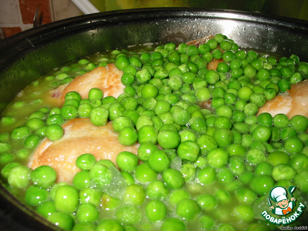 Добавляем горох и воду, чтобы не покрывало блюдо. Варим на среднем огне до готовности гороха, чтобы он дал чуть-чуть сок.