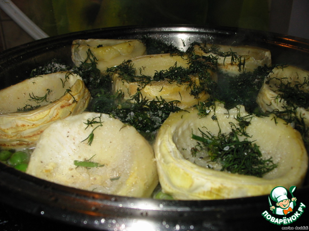 За 15-20 мин. до готовности добавляем в кастрюлю артишок, укроп, соль, перец.