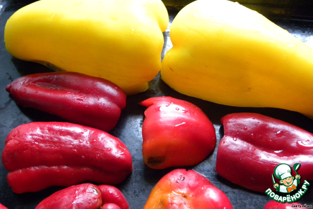Перец вымыть, разрезать пополам‚ выложить срезами вниз на противень и запечь под грилем 10 мин.‚ затем снять кожицу.