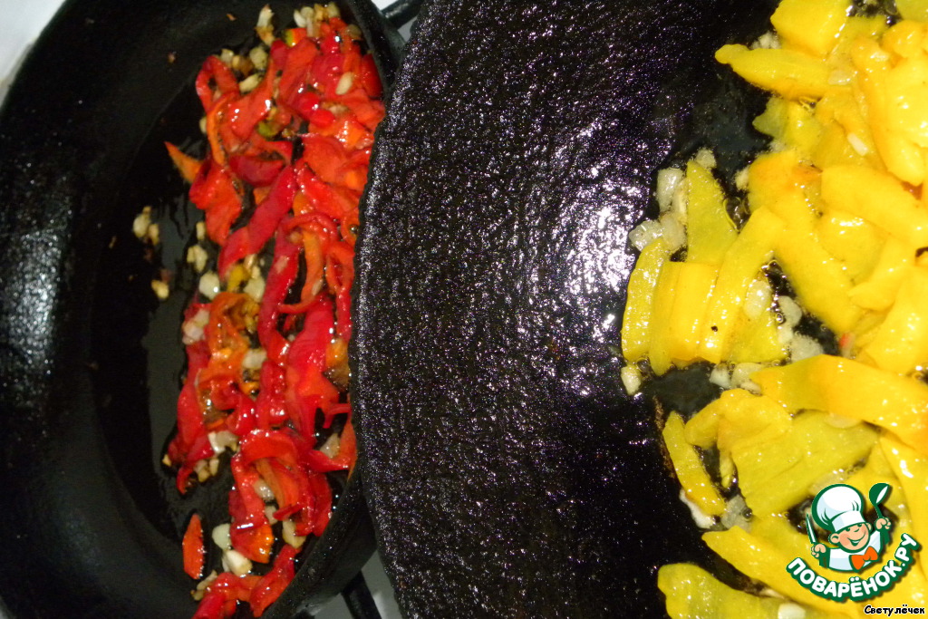 затем добавить по отдельности красный и жёлтый перец‚ тушить 5 мин.