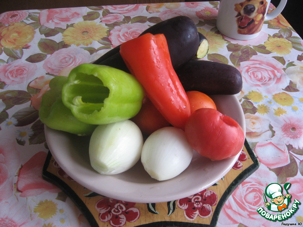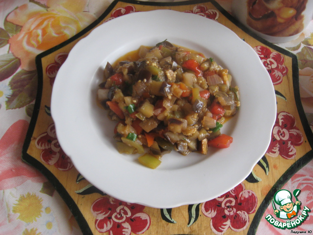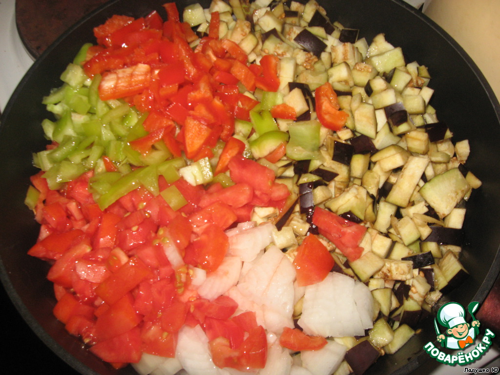 Нарезать все овощи кубиками, посолить, добавить сахар, хорошо перемешать, налить на сковороду растительное масло и выложить овощи.