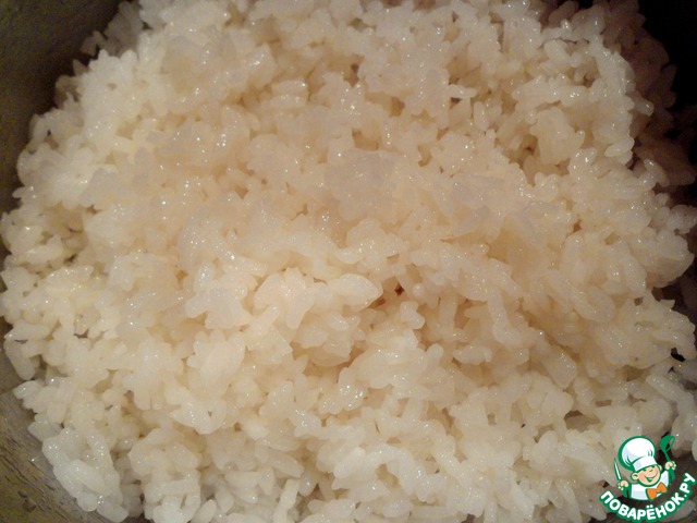 Рис Японика ТМ «Мистраль» промыть 7 раз в холодной воде, пока вода не станет прозрачной. Залить рис водой на 1,5см выше риса, как закипит, сделать самый маленький огонь, накрыть крышкой и варить 15 минут. Выключить и проложить между кастрюлей и крышкой кухонное полотенце и оставить еще на 15 минут.
