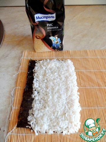 На коврик проложенный пищевой пленкой кладем ½ листа нори глянцевой стороной вниз. На него выкладываем готовый рис Японика ТМ «Мистраль» с нахлестом 1,5см.