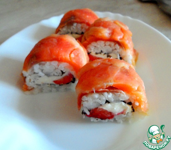 | Предлагаю Вашему вниманию роллы Филадельфия с необычной начинкой в виде клубники. Кисло-сладкая клубника придает блюду необыкновенно тонкий, новый и незабываемый вкус! Мои домашние теперь хотят есть Филадельфию только с клубникой, настолько им понравился этот фьюжн. |