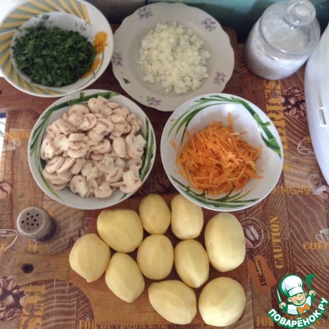 Подготавливаем ингредиенты. Лук нарезаем кубиками. Морковь натираем на крупной терке. Шампиньоны режем брусочками. Зелень рубим мелко.
