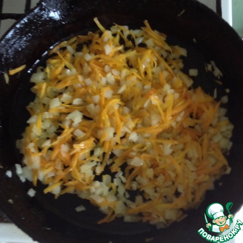 На сковородку наливаем масло. Нагреваем. Обжариваем лук с морковью.