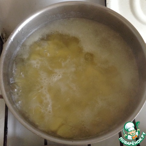 В кипящую, подсоленную воду, кидаем картошку, порезанную кубиками. Варим до готовности. Картофельный отвар сливаем в миску, но не выливаем!