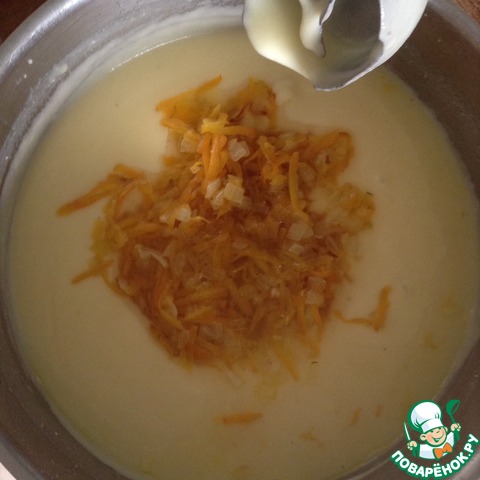 Добавляем обжаренные лук с морковкой. Взбиваем блендером.