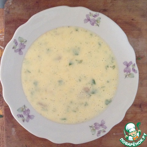 Добавляем зелень. Взбиваем блендером. В последнюю очередь добавляем шампиньоны. Перемешиваем ложкой. Солим, перчим по вкусу.