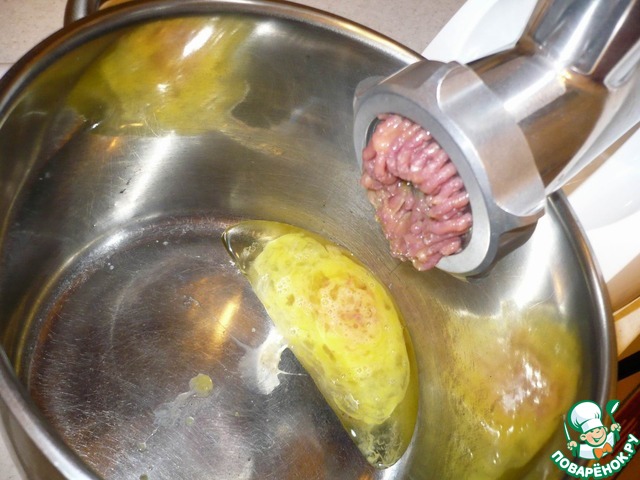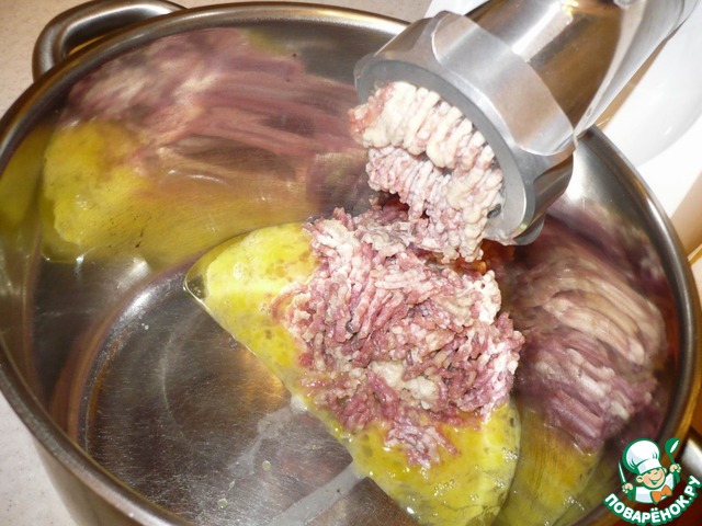 В большую кастрюлю разбиваем яйца, и начинаем прокручивать в мясорубке мясо.