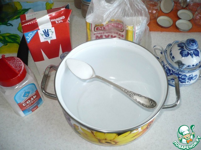 В широкую кастрюлю добавляем ингредиенты для приготовления теста для домашних пельменей. Сначала я положила соль + сахар.