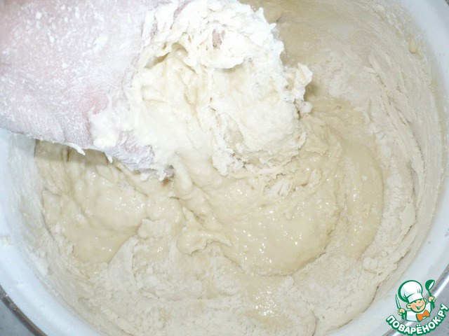 По мере того, как мы добавляем муку, наше тесто начинает становиться густым. После этого я начинаю тесто перемешивать руками, и так же постепенно подсыпаю муку.