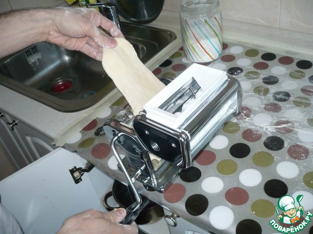 Как я уже говорила ранее, в другом моем рецепте о Домашней Лапше, что в моем арсенале кухонных приборов есть механическая машинка, которая называется "Тестораскатчик", марок таких машинок очень много, а принцип у всех одинаковый. С такой машинкой я однажды накрутила 8 кг домашних пельменей, моя морозилка еле выдержала такой натиск домашних пельмешей, которые в нее заходили ;-) В нашем рецепте, выход конечно же будет меньше!