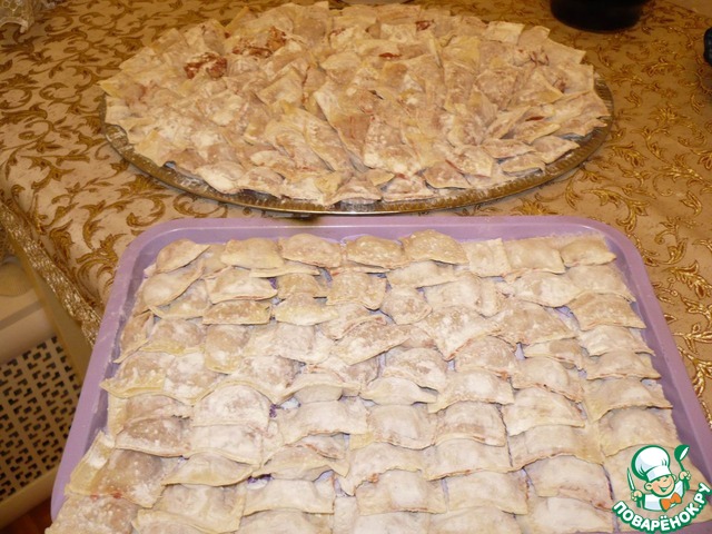 По мере готовности пельменей, я их выкладываю на подносы, которые я посыпаю мукой, чтобы пельмени не слиплись между собой! Расчищаю морозилку, и пельмени на этих подносах отправляются туда, для того, чтобы немного подморозиться примерно на 1-1.5 часа. Еще один совет: морозилка конечно не резиновая, а чтобы все поместилось, то на подносы я ставлю круглую металлическую решетку от СВЧ-печки, и подносы стоят в морозилке в несколько ярусов, а пока я кручу другую партию пельменей эти уже заморозились. После заморозки я их убираю в пакеты и храню в морозилке.