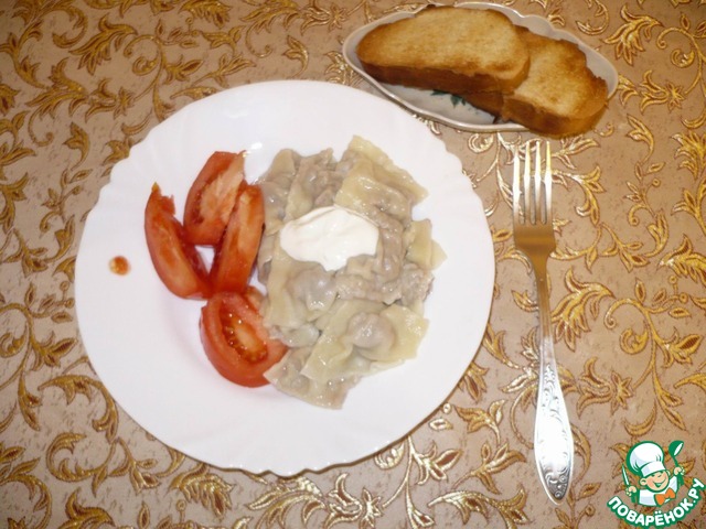 Получается во такой пельменный квадратик с очень красивыми рельефными концами. Тесто очень тоненькое и нежное, а начинки там достаточно для того чтобы ощутить этот замечательный вкус домашних пельменей, не то что в магазинных полуфабрикатах!
