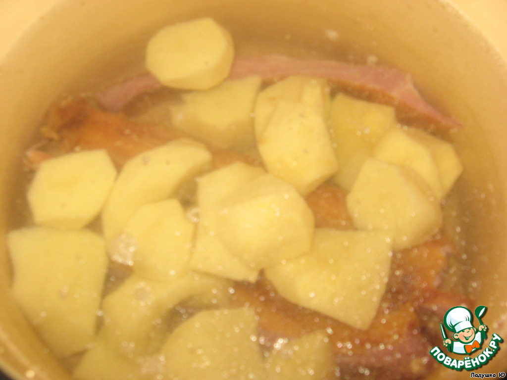 Копченые ребра и очищенный картофель залить водой и довести до кипения, добавить горошек и лавровый лист, варить до готовности картофеля и горошка.