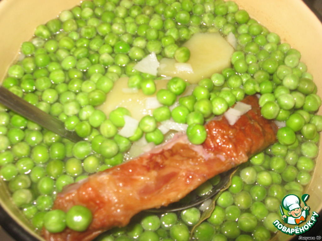 Супчик-пюре из зелeного горошка с копченостями