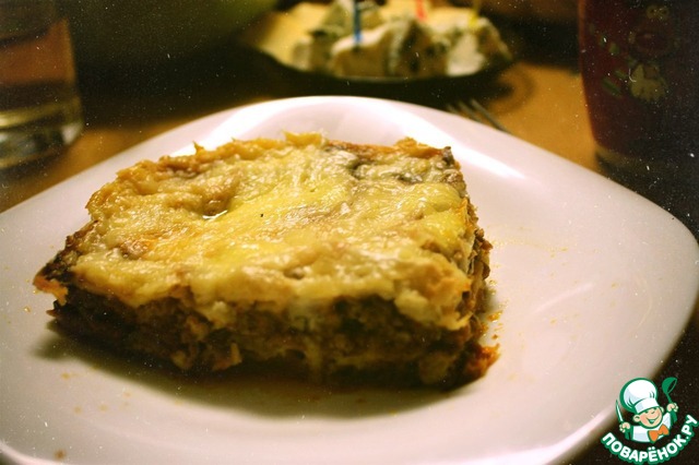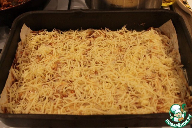 16)Готовую лазанью вынуть, посыпать Пармезаном (можно немного Пармезана отложить, чтобы посыпать им готовую лазанью), поставить в духовку еще на 5-10 минут.