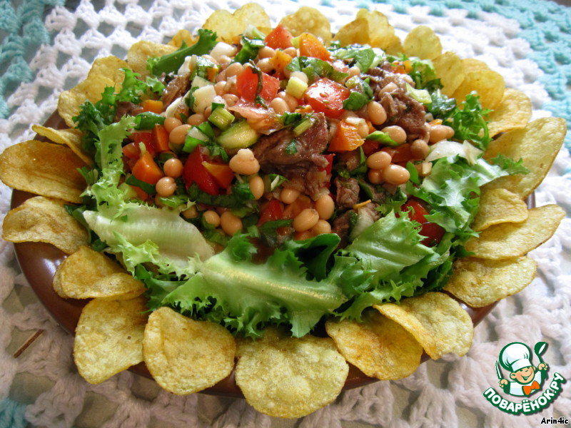 На листья выкладываем мясо-овощную смесь. Перед подачей по кругу выкладываем чипсы.