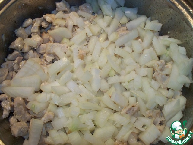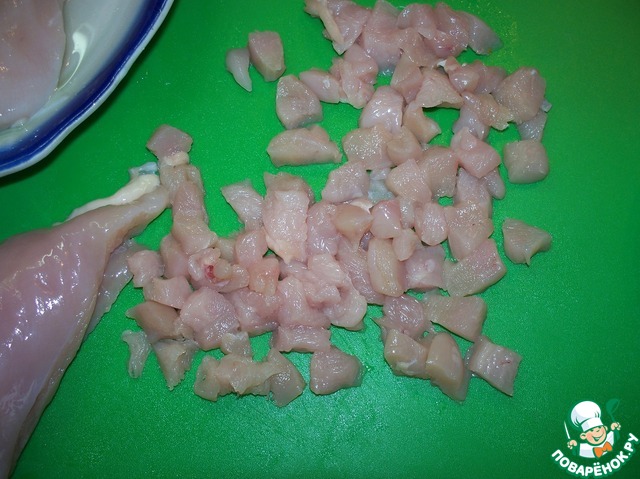 Курицу нарезаем кубиками, обжариваем в кастрюле на оливковом масле до золотистого цвета.
