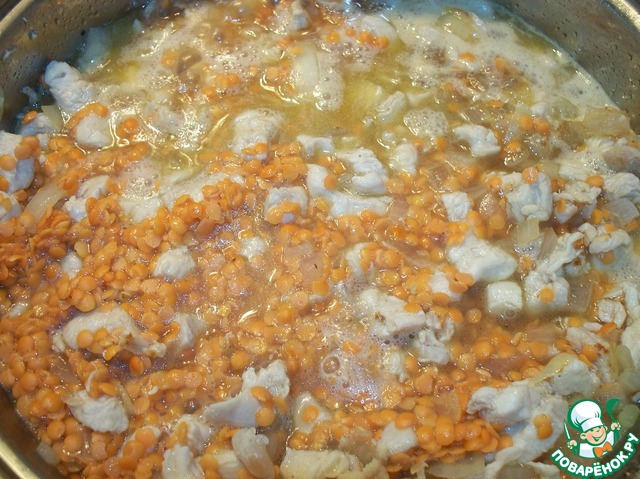 Далее добавляем чечевицу, заливаем 2 стаканами кипятка и тушим минут 20-25 до выкипания воды.