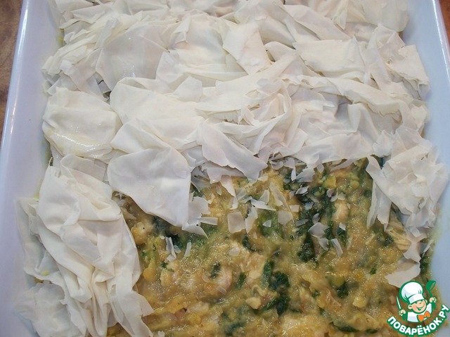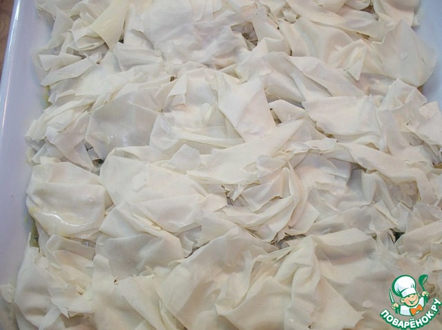 Форму для запекания хорошенько смазываем сливочным маслом и выкладываем смесь. Тесто фило разрываем на небольшие квадраты, сминаем их и выкладываем сверху.