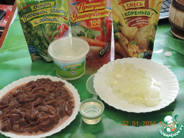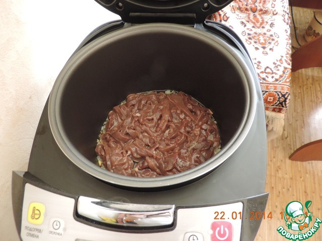 Минут через 3-5 после начала программы добавляем печень, перемешиваем и готовим до окончания программы