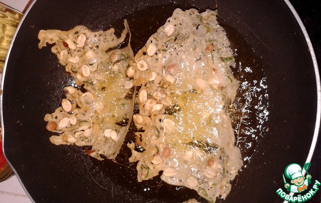 Каждый раз перед тем, как выложить смесь на сковородку, перемешивайте, орехи и арахис быстро оседают на дне. Столовой ложкой наливаете вдоль верха бортика, смесь стекает вниз и зажаривается в масле. Надеюсь, по фото понятно :)