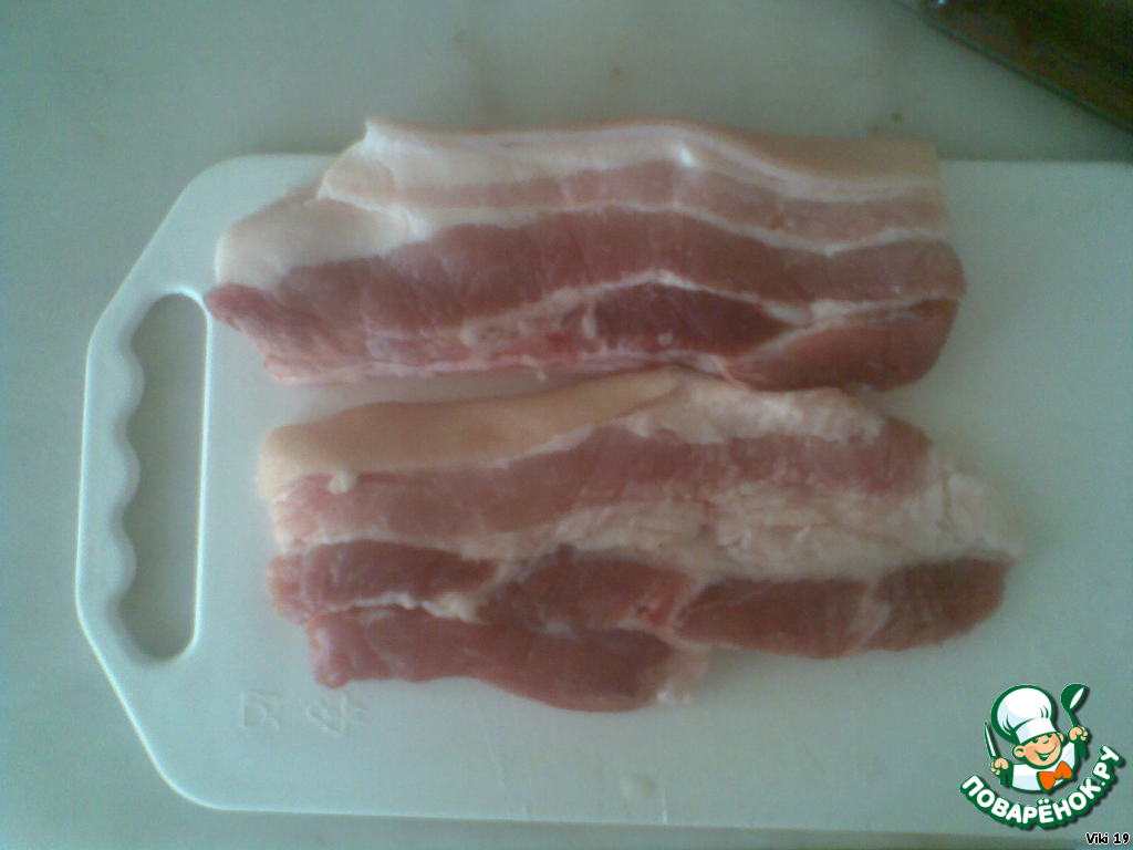 Возьмите 200г свежего бекона (лучше пожирнее) или сала. Солим, перчим, режем кубиками.