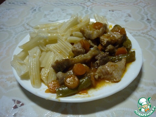 Свинину нарезать кубиками и закинуть в сковороду с овощами. посолить, поперчить