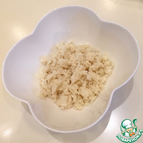 Берем глубокую тарелку, измельчаем в нее хлебный мякиш.