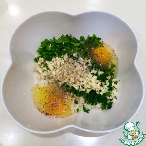 Добавляем к нему мелко нарезанную петрушку и чеснок, яйца, солим-перчим.