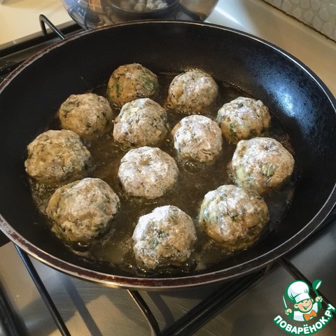 Обваливаем их в муке и обжариваем на сковороде на небольшом огне по 3 минутки с каждом стороны.