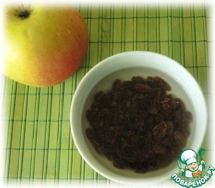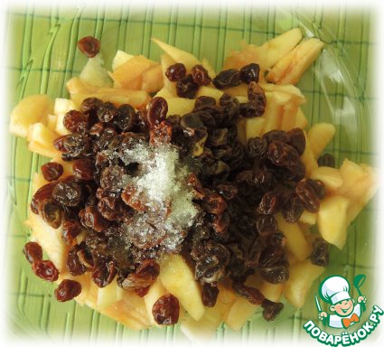 К яблокам добавляем изюм и сахар. Перемешиваем.