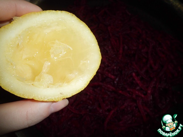 Свеклу чистим, трем на терке (комбайне) и отправляем на сковороду, на средний огонь. Добавляем сок половины лимоны. Тушим в течении часа, при необходимости добавляем немного воды.