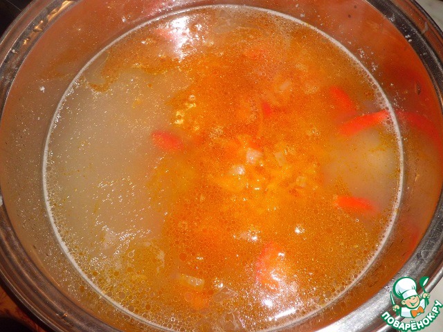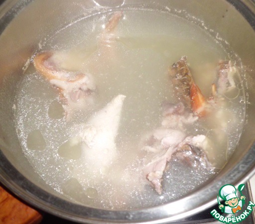 Извлекаем из бульона курицу, отделяем мясо и возвращаем мясо обратно. Добавляем перловую крупу (если вы готовили её отдельно), зажарку.