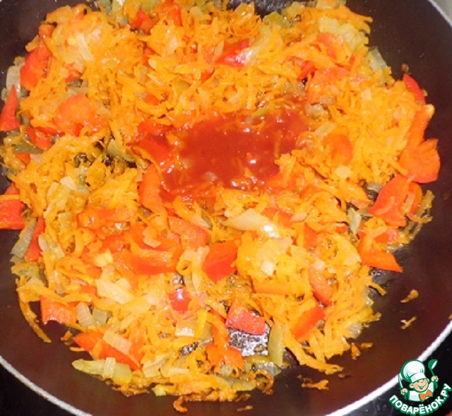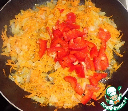 Лук с морковью обжариваем почти до готовности, добавляем болгарский перец, через несколько минут...